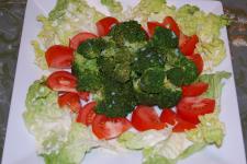 stropiti buchetele de broccoli cu sos, decorati platoul cu felii de rosii si salata verde.
