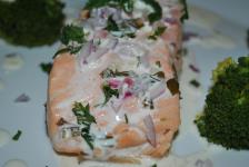 Somon cu menta verde, sos picant de smantana si brocoli fiert