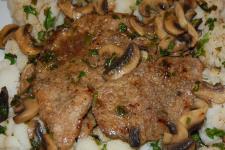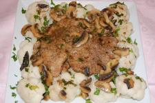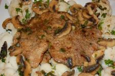 asezati scaloppinele pe un platou, turnati sosul de ciuperci si decorati cu patrunjel.