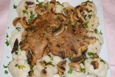 garnitura pentru scaloppine poate fi: un piureu de cartofi, cartofi la cuptor cu rozmarin sau legume fierte la aburi (in cazul de fata, conopida fiarta la steamer).