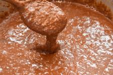 intre timp, se prepara crema. se topeste ciocolata neagra intr-o cratita groasa cu 5 linguri de lapte de soia si o lingura de ulei. va rezulta o crema care pare taiata. se retrage de pe foc si se amesteca cu gemul de cirese negre (4-5 linguri). imediat veti observa ca glazura de ciocolata isi revine, devine fina, matoasoasa, cremoasa. in cazul gemului pe care l-am folosit, existau cirese intregi, care au determinat un aspect neregulat al glazurii, dar au adus un plus de gust. daca doriti o glazura perfect fina, folositi un gem fin sau chiar un jeleu. cu jeleu, glazura devine si mai stralucitoare.
