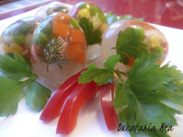 Gelatina se pune la inmuiat in 100 ml apa timp de 10 minute. In supa de pui gata condimentata (ca pentru supa de taitei) si putin incalzita se pune gelatina si se amesteca bine pana se dizolva complet gelatina. Se toarna supa peste legume in oua. Se dau la rece pana se intareste gelatina. Se decojesc cu grija pentru a nu le strica forma.