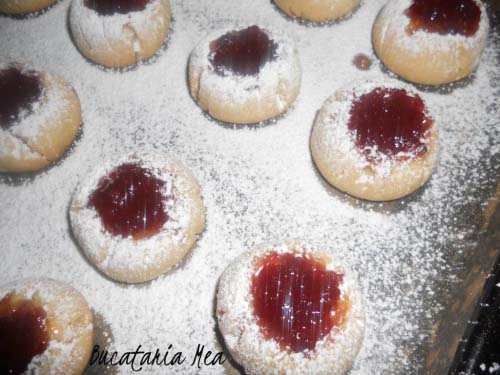 Se dau la cuptorul incins la 180*C pentru 15-20 minute sau pana se rumenesc pe margini. Dupa racire, pudram fursecurile cu zahar pudra. Stergem zaharul pudra din mijloc cu o pensula inmuiata in gem.