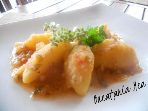 Se pune ceapa la calit in putin ulei, se adauga cartofii taiati felii apoi se acopera cu apa. Se condimenteaza si se lasa la fiert. Daca apa scade si nu sunt fierti, se mai adauga apa. Se pune bulionul. Stingem focul si adaugam marar tocat