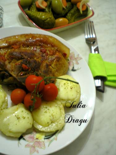 Pulpa de porc la capac cu cartofi la cuptor si topping de cascaval